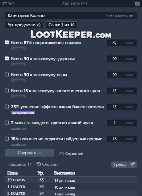 Заново проверяем его цену через программу (уже без выставления свободного свойства, ведь мы его "заполнили"). Если мы докрафтили свойство-суффикс на сопротивление к хаосу, то не забываем в опции Скрытые включить сопротивление к хаосу. Таким образом мы получим более точную цену за наше кольцо.